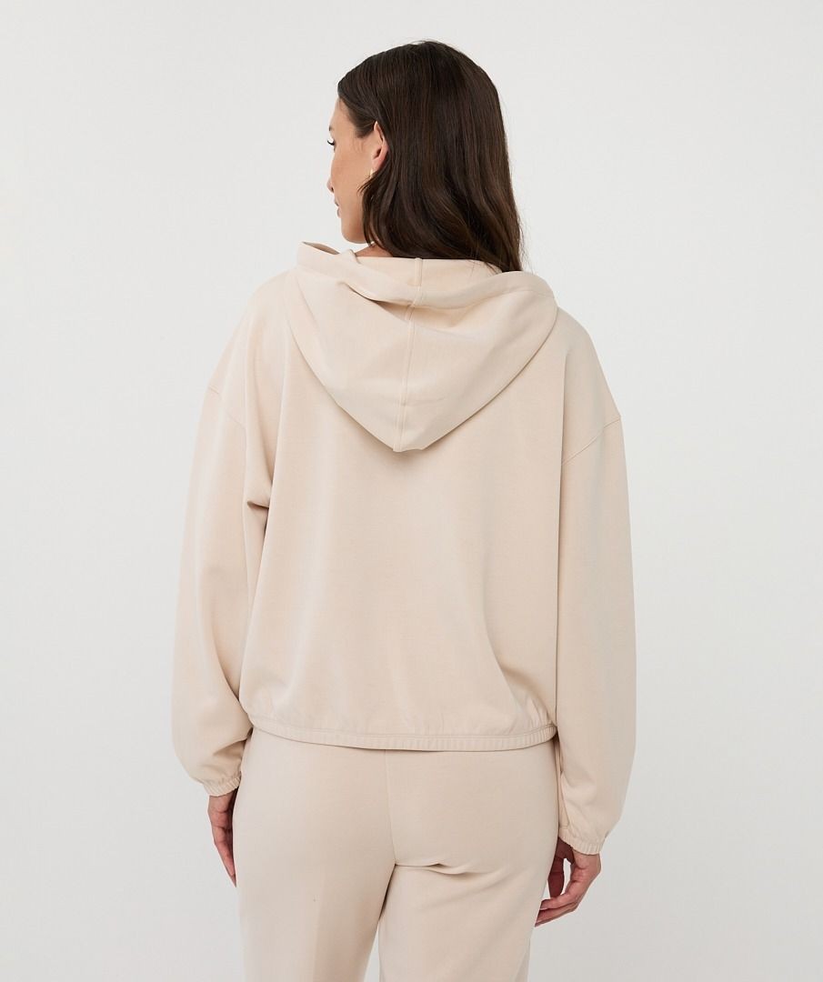 Sweat à capuche confortable en modal avec cordon de serrage et capuche ornée de strass scintillants. Complétez votre ensemble confortable avec la jupe ou le pantalon cargo assorti. Le mannequin mesure 1,73 m et porte une taille 38 - Composition : 48 % modal - 48 % polyester - 4 % élasthanne