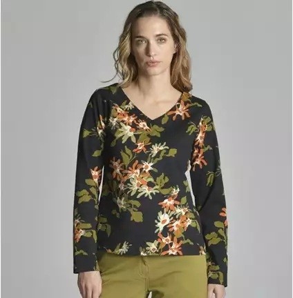 Haut féminin confectionné en 100% coton bio doux et respirant. Col V souligné d'une couture discrète qui structure l'encolure avec élégance. Imprimé floral dans des tons kaki et orange qui apporte une touche naturelle et lumineuse. Manches longues pratiques et confortables pour la mi-saison ou l'hiver. Coupe légèrement cintrée qui met en valeur la silhouette sans la contraindre. Un modèle écoresponsable et raffiné, facile à porter au quotidien avec un jean ou une jupe.