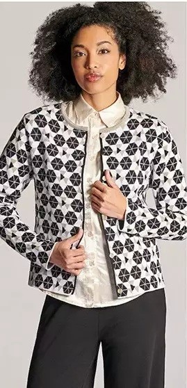 Gilet en maille 100% coton au motif géométrique chic blanc, noir et beige. Col rond classique qui met en valeur la silhouette. Finitions originales avec de petites vagues aux poignets et en bas du modèle. Boutons bicolores, noirs et beiges, pour un détail raffiné et moderne. Maille d'une bonne épaisseur qui assure confort et chaleur. Un gilet élégant et facile à porter, parfait en pièce phare de vos tenues.