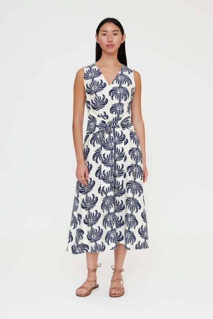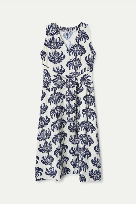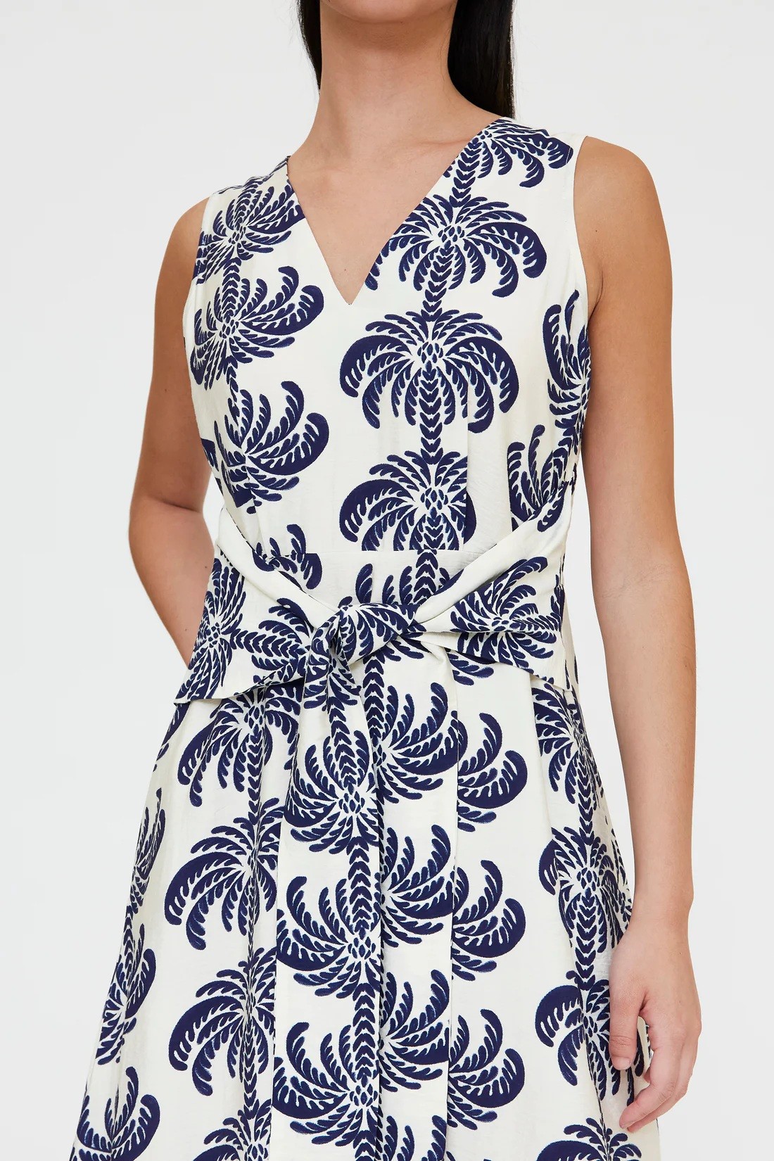 Robe midi en crêpe à imprimé palmiers. Décolleté en V, sans manches. Ceinture à nouer. Le mannequin mesure 173 cm et porte une taille S. Composition : 85 % viscose, 15 % polyamide (Pays création : Espagne, Madrid)