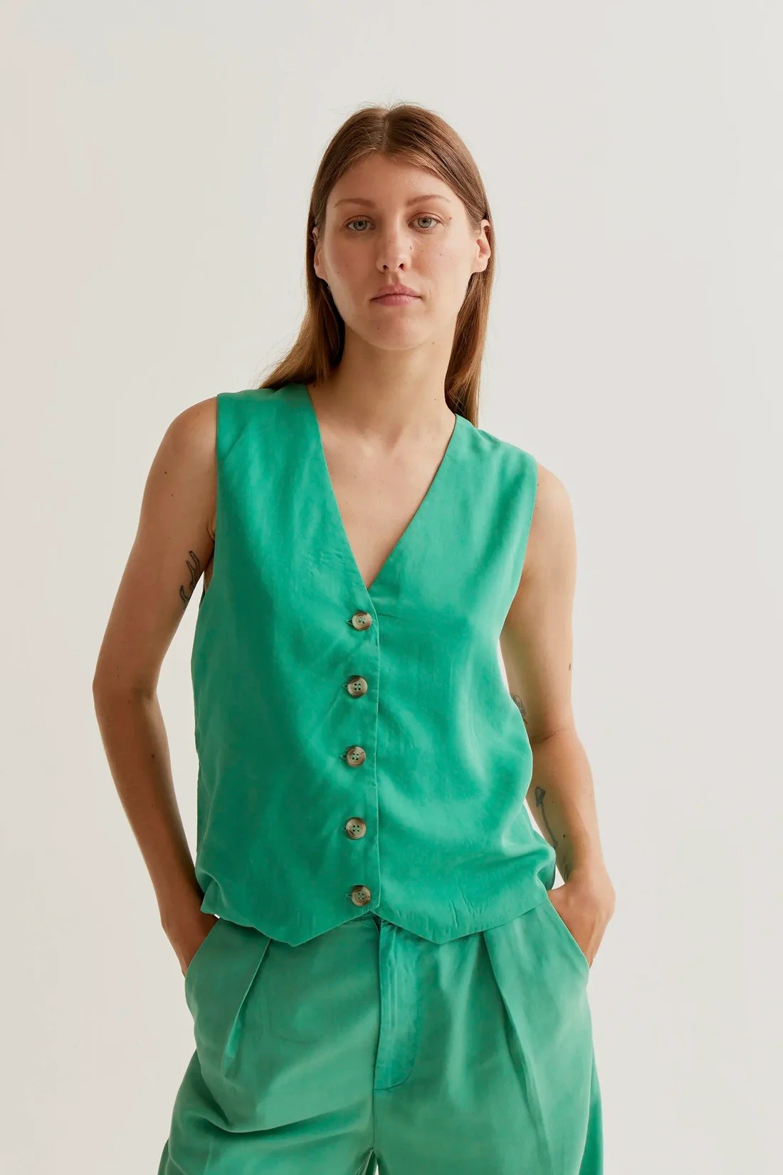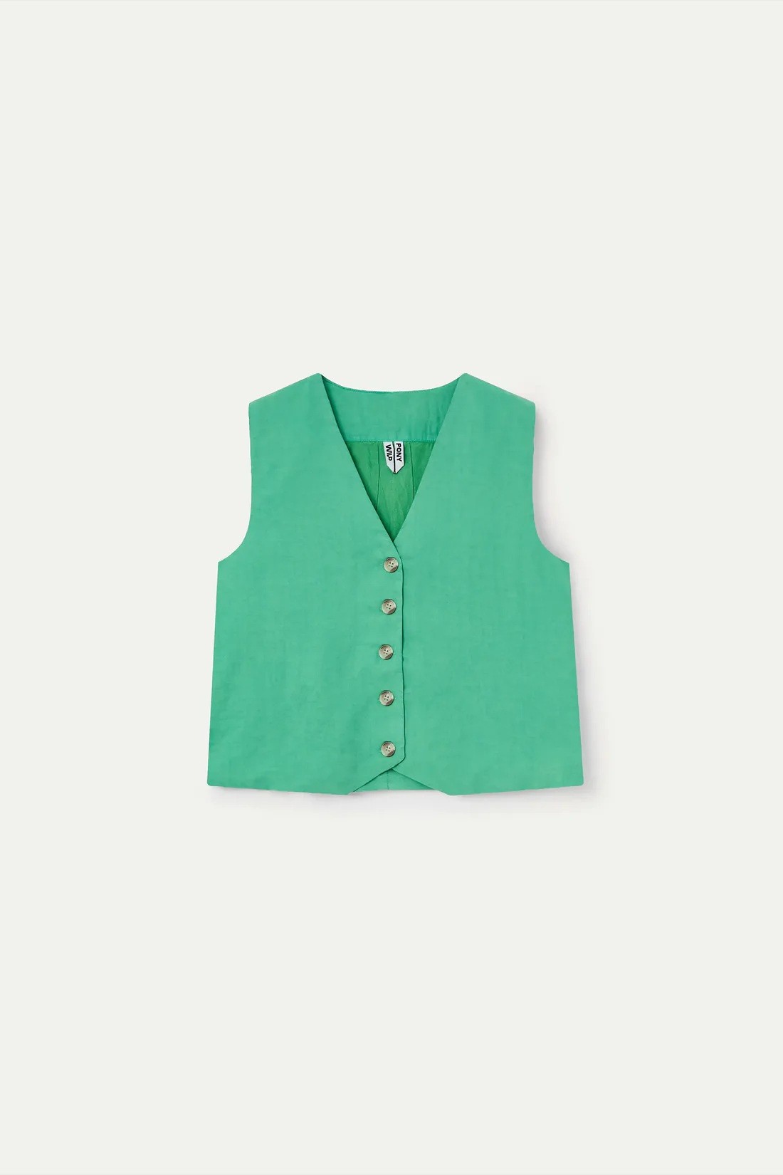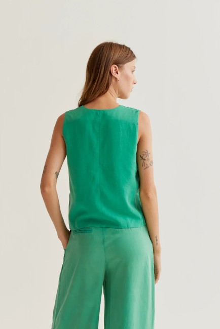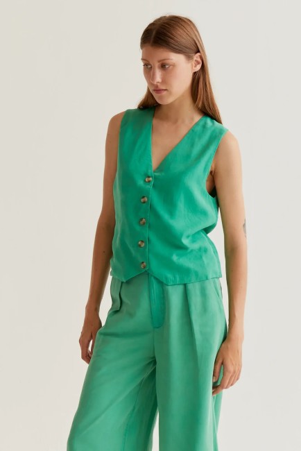 Spencer vert. Col en V et sans manches. Fermeture boutonnée sur le devant. Le mannequin mesure 177 cm et porte une taille S. Composition : 100 % coton