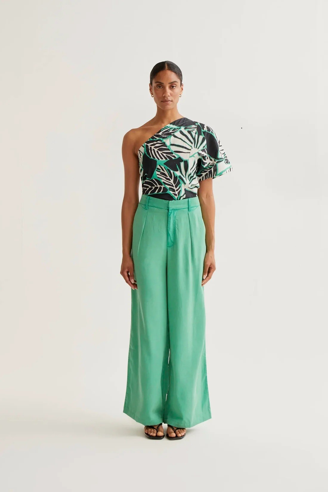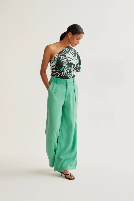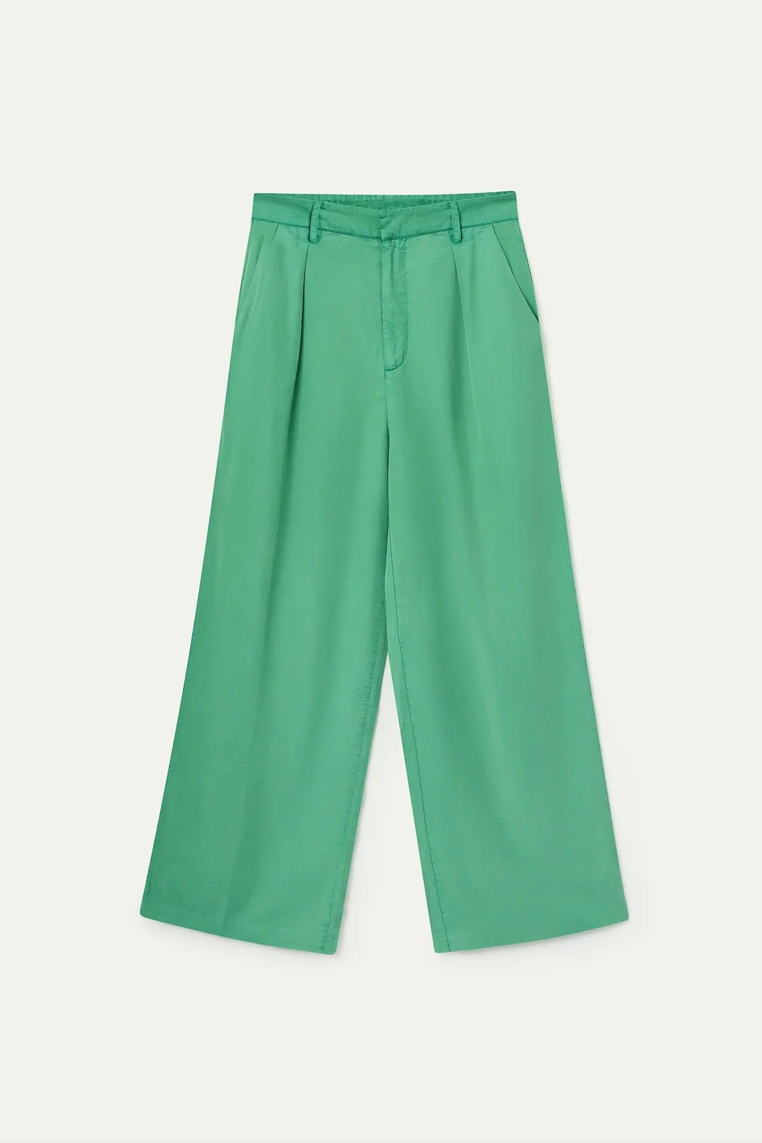 Pantalon en lyocell vert fluide. Taille haute avec ceinture fixe et jambes larges. Fermeture éclair invisible et boutonnière. Le mannequin mesure 173 cm et porte une taille S. Composition : 100% Lyocel