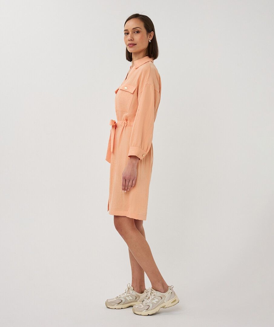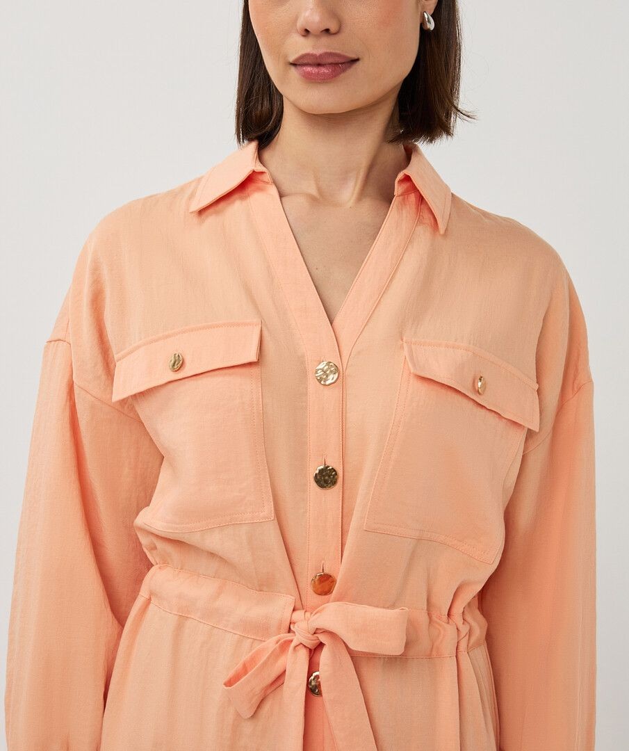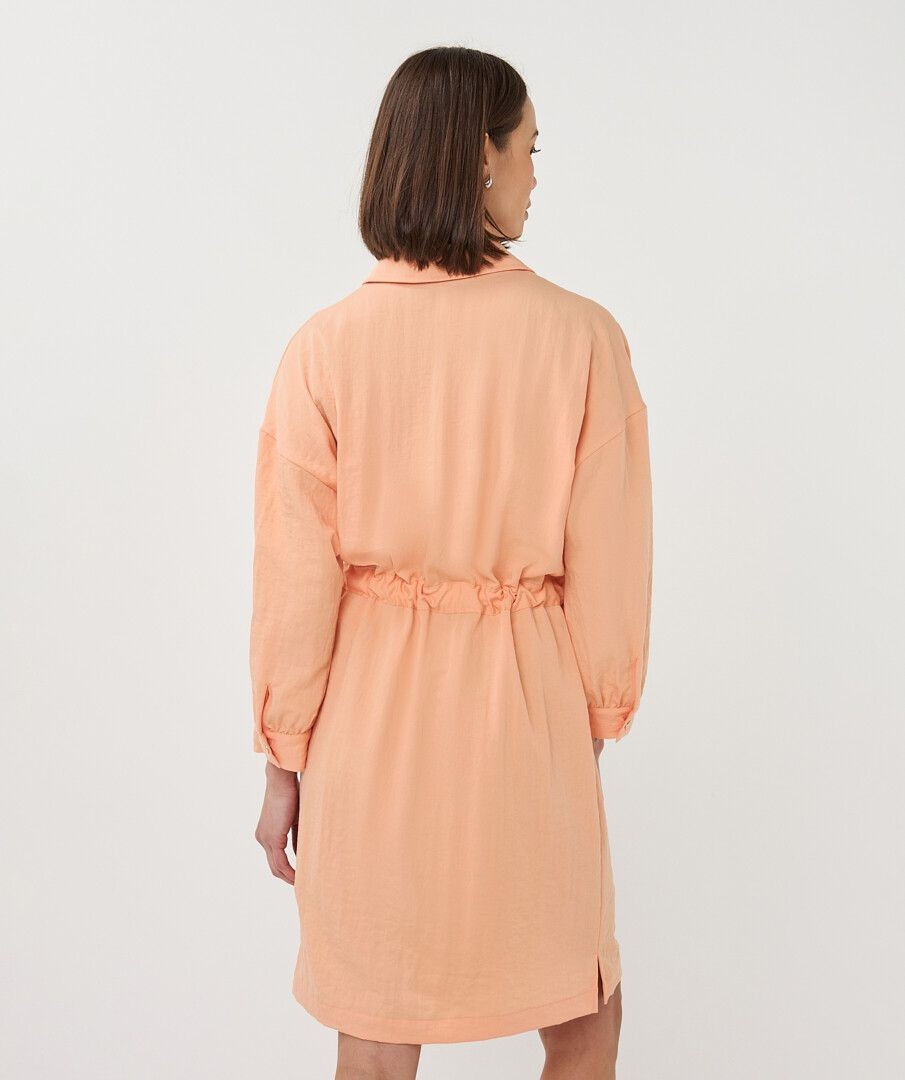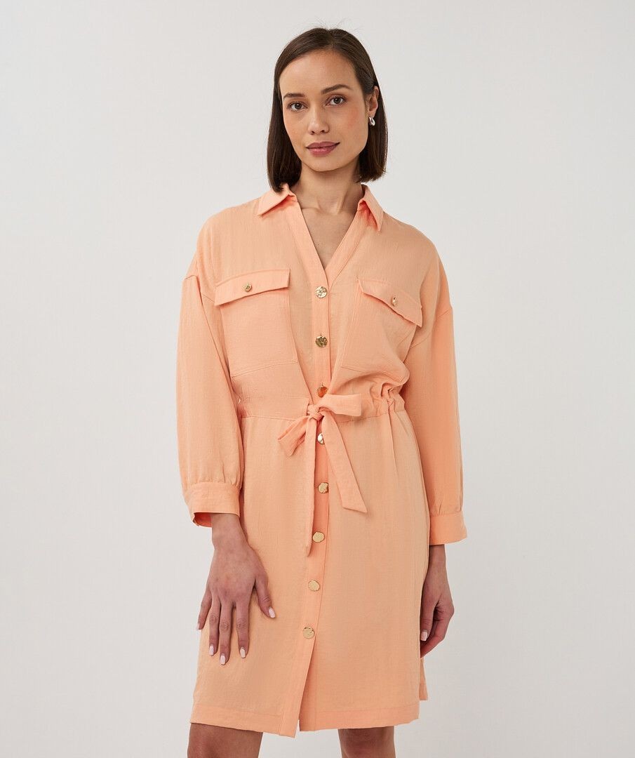 Description courte : Féminine et élégante, cette robe-chemise abricot illumine la silhouette avec sa taille marquée et ses boutons dorés. Une pièce légère et facile à porter tout l’été. Description détaillée : Cette robe-chemise Esqualo séduit par sa jolie couleur abricot douce et lumineuse. Sa coupe fluide est soulignée par une ceinture à nouer à la taille qui met la silhouette en valeur tout en restant confortable. Les poches cargo sur la poitrine et les boutons métallisés dorés ou argentés apportent une touche moderne et raffinée. Facile à porter au quotidien comme pour une occasion plus habillée, elle se porte aussi bien avec des sandales qu’avec des baskets. Confectionnée dans une matière légère composée de 80 % rayonne et 20 % nylon, elle est agréable à porter tout au long de la journée. Détails : Robe-chemise fluide Coloris : abricot Boutons métallisés dorés ou argentés Poches cargo sur la poitrine Ceinture à nouer à la taille Manches longues avec poignets boutonnés Matière : 80 % rayonne, 20 % nylon Disponible jusqu’au 46- robe chemise femme- robe abricot femme- robe chemise abricot- robe ceinture taille- robe élégante femme- robe fluide femme- robe printemps été- robe femme jusqu’au 46- robe Esqualo- robe manches longues femme- robe chic femme- robe légère femme-