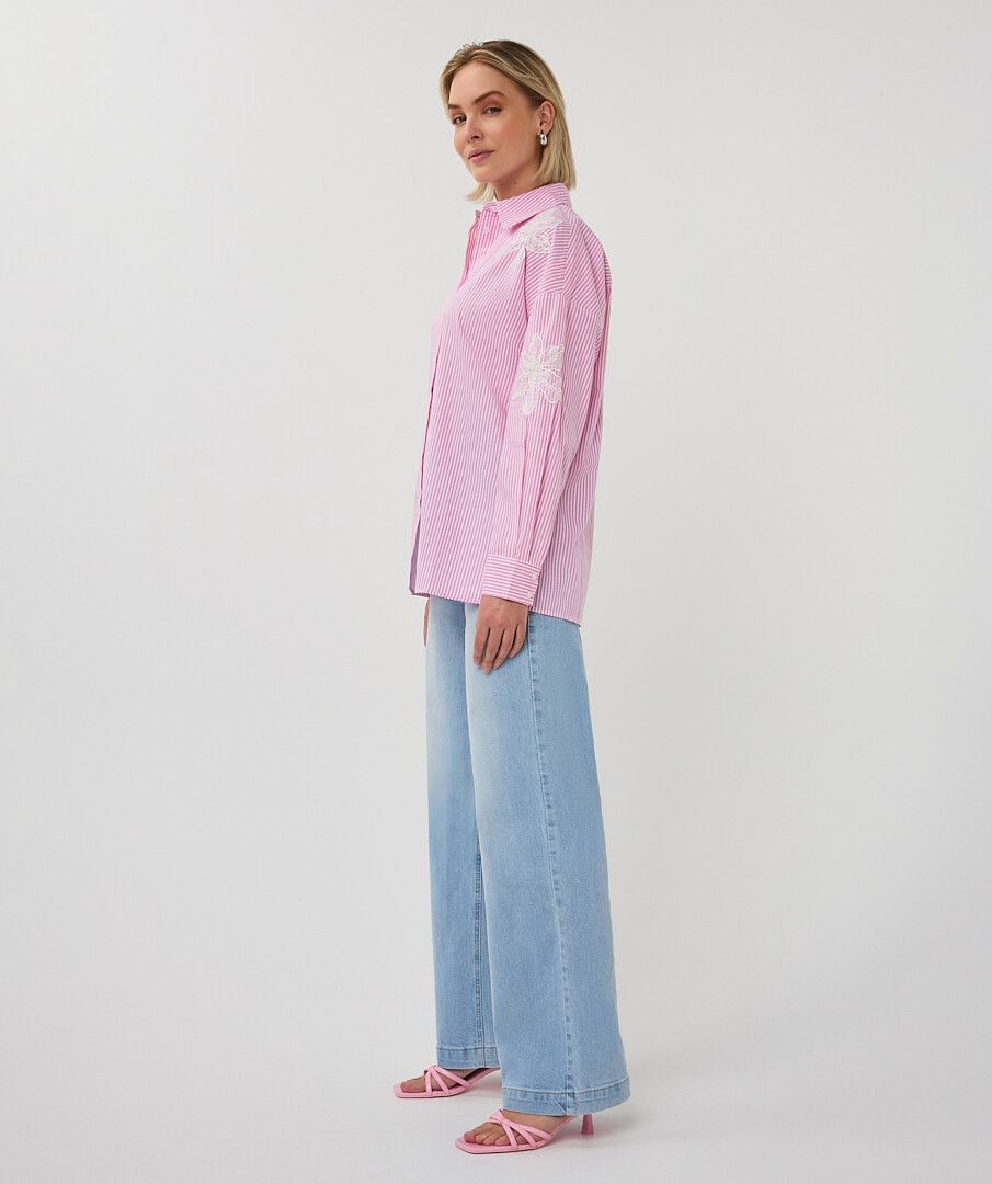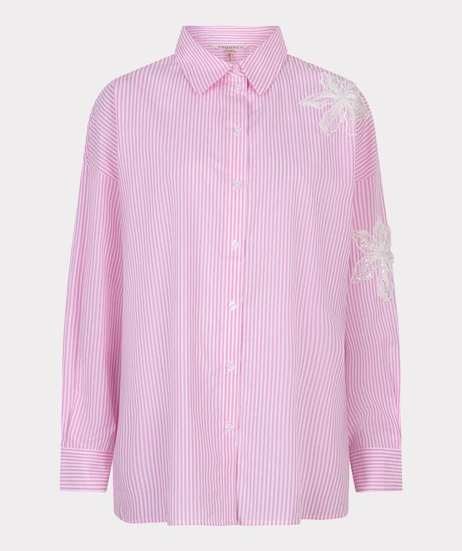 Description courte : Originale et féminine, cette chemise rayée rose apporte une touche lumineuse à votre tenue. Sa broderie florale blanche sur l’épaule et la manche lui donne un style élégant et raffiné. Description détaillée : Cette chemise Esqualo séduit par ses fines rayures roses et blanches et sa coupe légèrement ample, agréable à porter. La broderie florale blanche placée sur l’épaule et la manche apporte une touche délicate et originale. Facile à porter avec un jean, un pantalon blanc ou une jupe, elle illumine la silhouette et donne immédiatement du style à une tenue. Détails : Chemise à rayures roses et blanches Broderie florale blanche sur l’épaule et la manche Manches longues retroussables Coupe légèrement ample Disponible jusqu'au 46 - chemise rose femme chemise rayée rose femme chemise brodée femme chemise élégante femme chemise fleurie femme chemise femme jusqu’au 46 chemise Esqualo chemise femme printemps été chemise rose et blanche femme