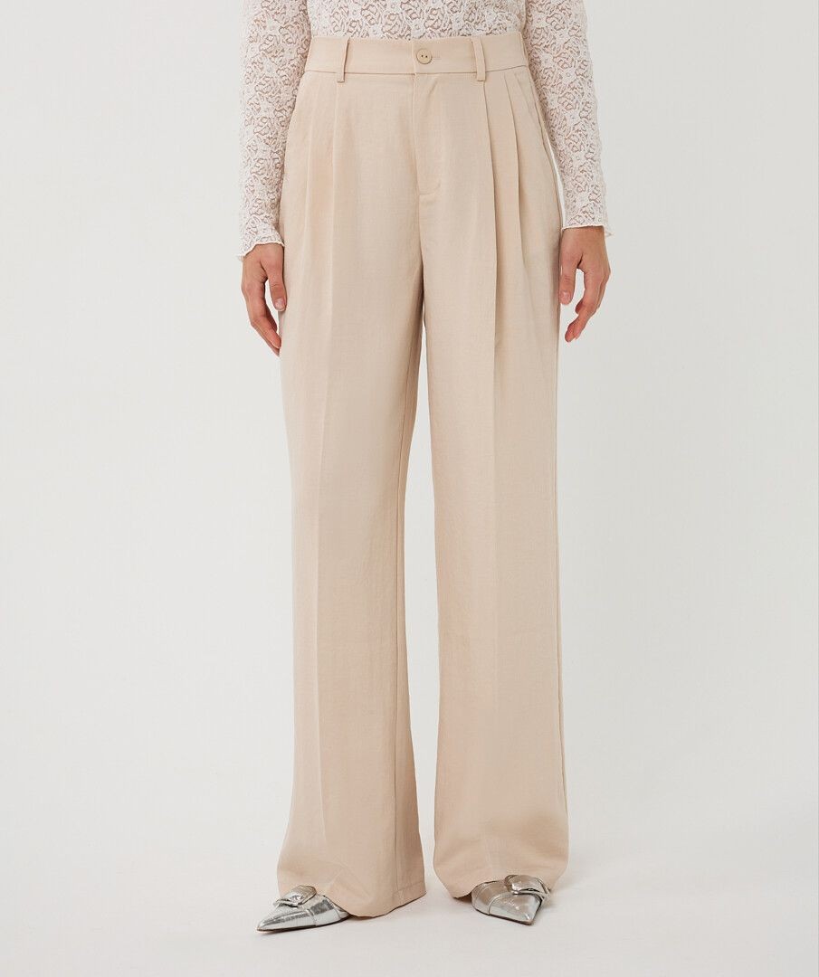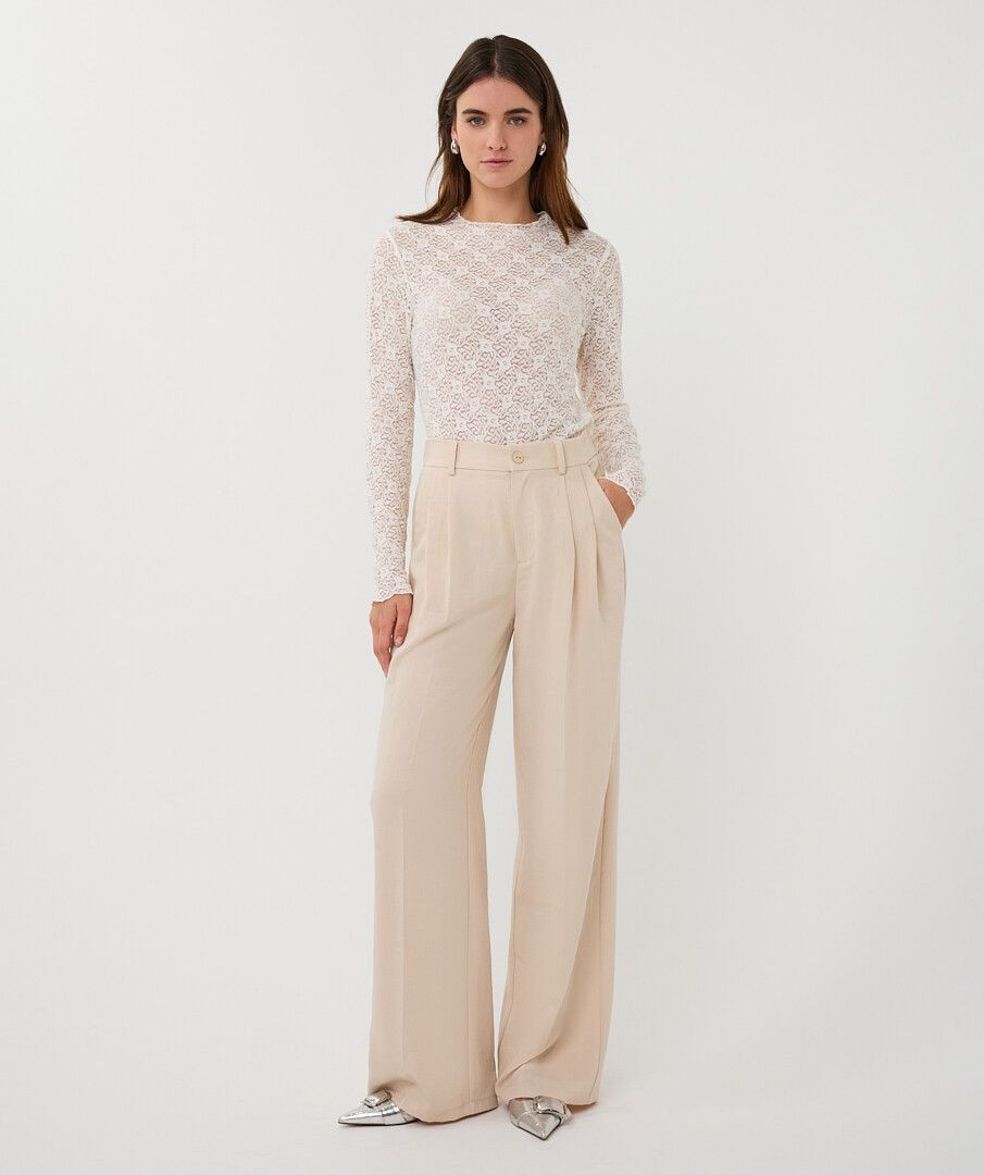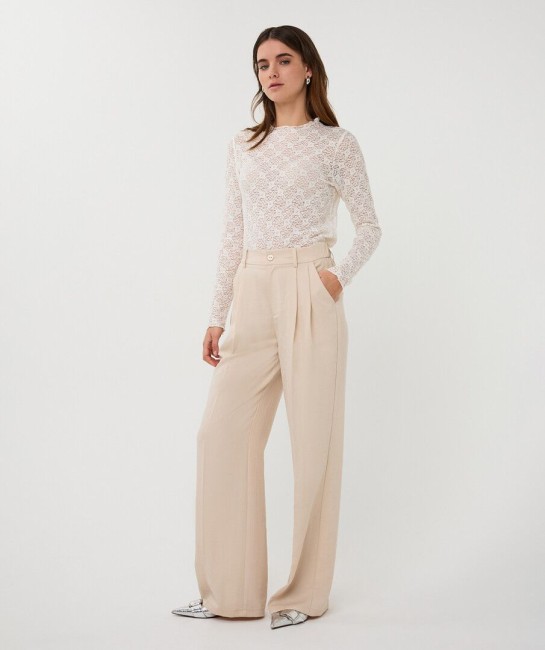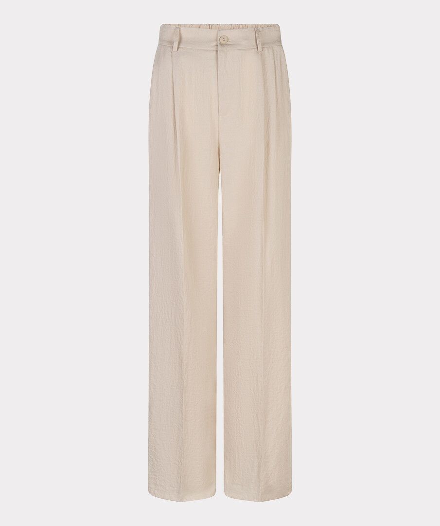 Description courte : Élégant et facile à porter, ce pantalon large beige clair apporte une touche chic et lumineuse à votre silhouette. Description détaillée : Ce pantalon large Esqualo séduit par sa coupe fluide et sa jolie teinte beige clair. Sa ceinture plissée et sa taille élastiquée offrent un confort parfait tout en mettant la silhouette en valeur. Les poches italiennes sur le devant et les fausses poches passepoilées à l’arrière apportent une finition élégante et raffinée. Facile à associer avec un chemisier, un top en dentelle ou la veste assortie, il convient aussi bien pour une tenue chic que pour le quotidien. Confectionné dans une matière légère composée de 80 % rayonne et 20 % nylon, il est agréable à porter toute la journée. Détails : Pantalon large et fluide Coloris : beige clair Ceinture plissée Taille élastiquée Poches italiennes sur le devant Fausses poches passepoilées à l’arrière Matière : 80 % rayonne, 20 % nylon Disponible jusqu’au 46 -pantalon large femme pantalon beige clair femme - pantalon fluide femme - pantalon élégant femme - pantalon taille élastique femme - pantalon chic femme - pantalon femme jusqu’au 46 - pantalon Esqualo - pantalon habillé femme - pantalon printemps été femme -