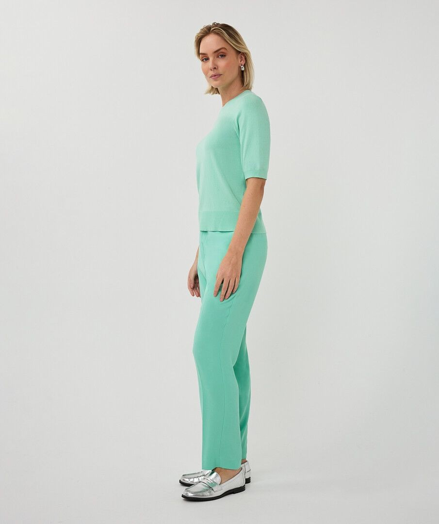 Description courte : Pantalon vert d’eau élégant avec pli marqué, fermeture asymétrique et taille élastiquée. Description détaillée : Ce pantalon long Esqualo séduit par sa couleur vert d’eau lumineuse et sa coupe élégante. Son pli marqué à l’avant structure la silhouette tandis que sa fermeture boutonnée asymétrique apporte une touche moderne et originale. La taille élastiquée garantit un confort optimal au quotidien. Il est également doté de fausses poches passepoilées à l’arrière pour une finition soignée. Facile à associer avec un top ou un pull léger, ce pantalon est parfait pour un look chic et actuel. Détails : Pantalon long femme, Coloris : vert d’eau, Pli marqué à l’avant, Fermeture asymétrique boutonnée, Taille élastiquée, Fausses poches passepoilées à l’arrière, Coupe élégante, Disponible jusqu’au 46 - pantalon vert femme - pantalon vert d’eau femme - pantalon chic femme - pantalon taille élastique - pantalon élégant femme - pantalon mode femme - pantalon Esqualo - pantalon femme printemps été - pantalon fluide femme - pantalon femme jusqu’au 46