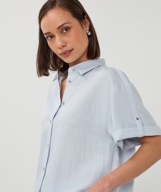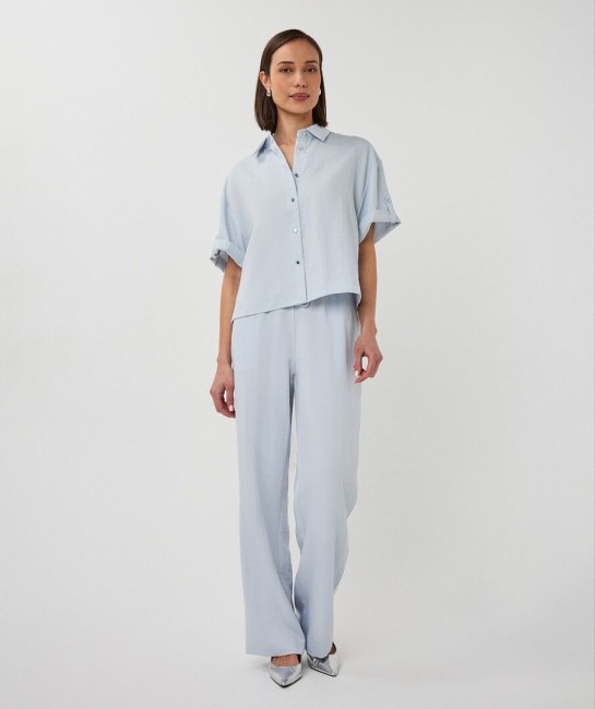 Craquez pour ce chemisier court bleu ciel à la coupe fluide et moderne. Ses boutons-pression et ses manches retroussées lui apportent une allure à la fois chic et décontractée. Léger et agréable à porter, il s’associe parfaitement avec le pantalon assorti pour un look élégant ou avec un jean pour une tenue plus casual. Composition : 80 % rayonne, 20 % nylon