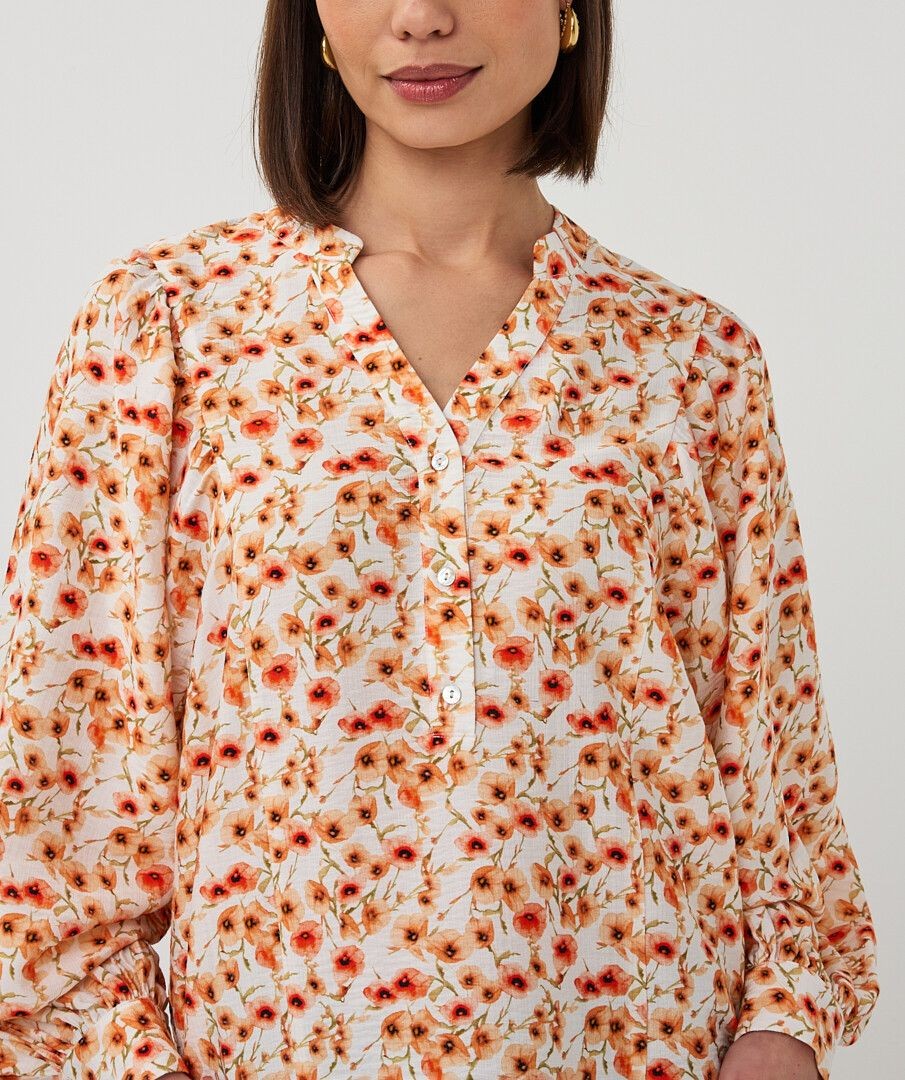 Description produit : Apportez une touche de fraîcheur à votre dressing avec cette blouse fluide à imprimé floral délicat. Son col en V boutonné et ses manches longues légèrement bouffantes offrent une silhouette féminine et élégante. Facile à associer avec un jean ou un pantalon clair, elle se porte aussi bien au quotidien qu’en version habillée. blouse femme fleurie, blouse Esqualo, blouse orange femme, blouse écru femme, chemisier floral femme, blouse manches longues femme, blouse fluide femme, blouse chic femme, blouse printemps femme, blouse élégante femme, nouveauté Esqualo, blouse tendance femme